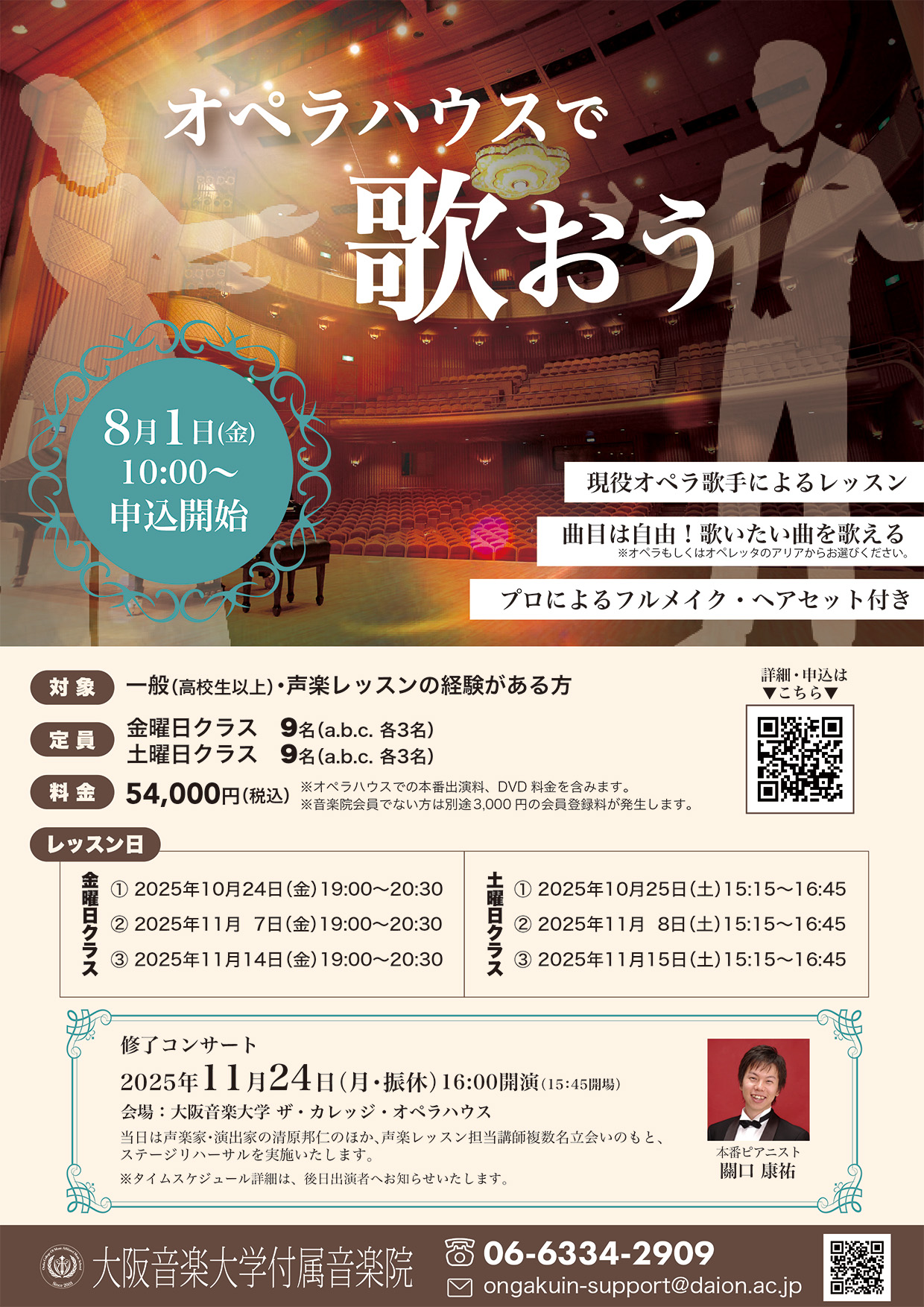 | 修了コンサート | 日程/2025年11月24日(月・振休) 会場/ザ・カレッジ・オペラハウス 開演/16:00(開場/15:45)終演/19:00予定 ※金曜日&土曜日クラス合同のコンサートとなります。 ※同日午前からステージでのリハーサル(本番ピアニスト付)や、メイクアップを順次行います。タイムスケジュールは講座開始後、受講生へお知らせいたします。 |