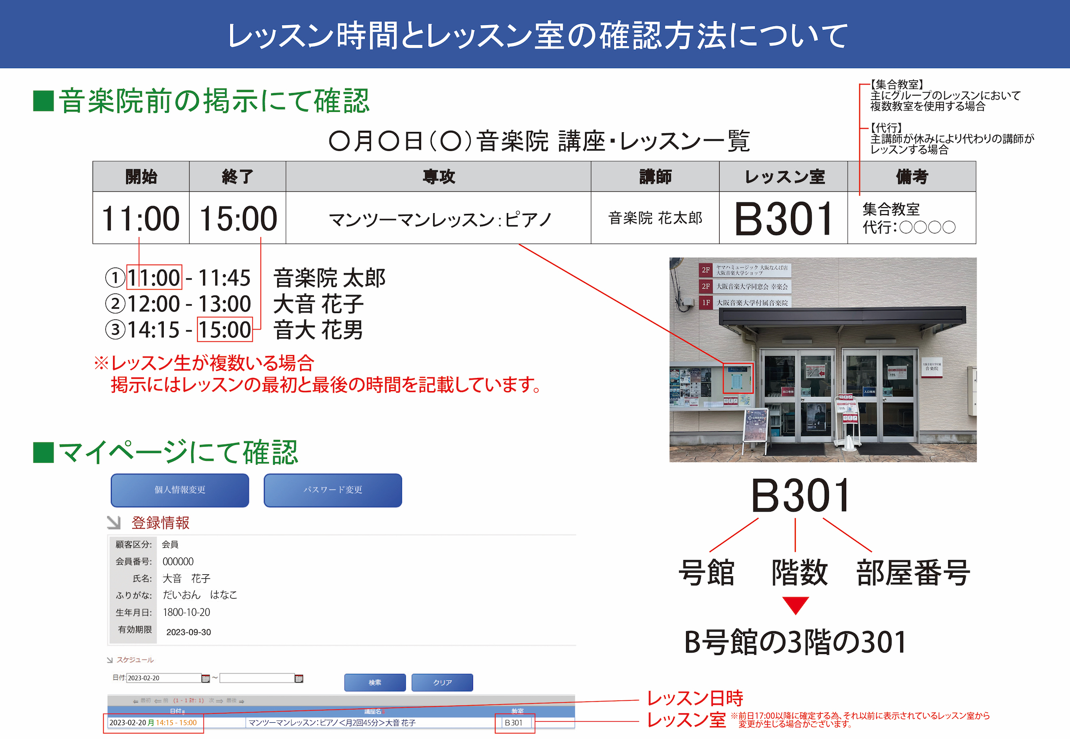| 授乳室・おむつ交換室・ベビーカー置き場 | 授乳室:レッスン実施教室内に簡易授乳室をご用意しています。 おむつ交換室:レッスン実施教室の同階にご用意しています。 ベビーカー:同建物1階にベビーカー置き場をご用意しています。 |